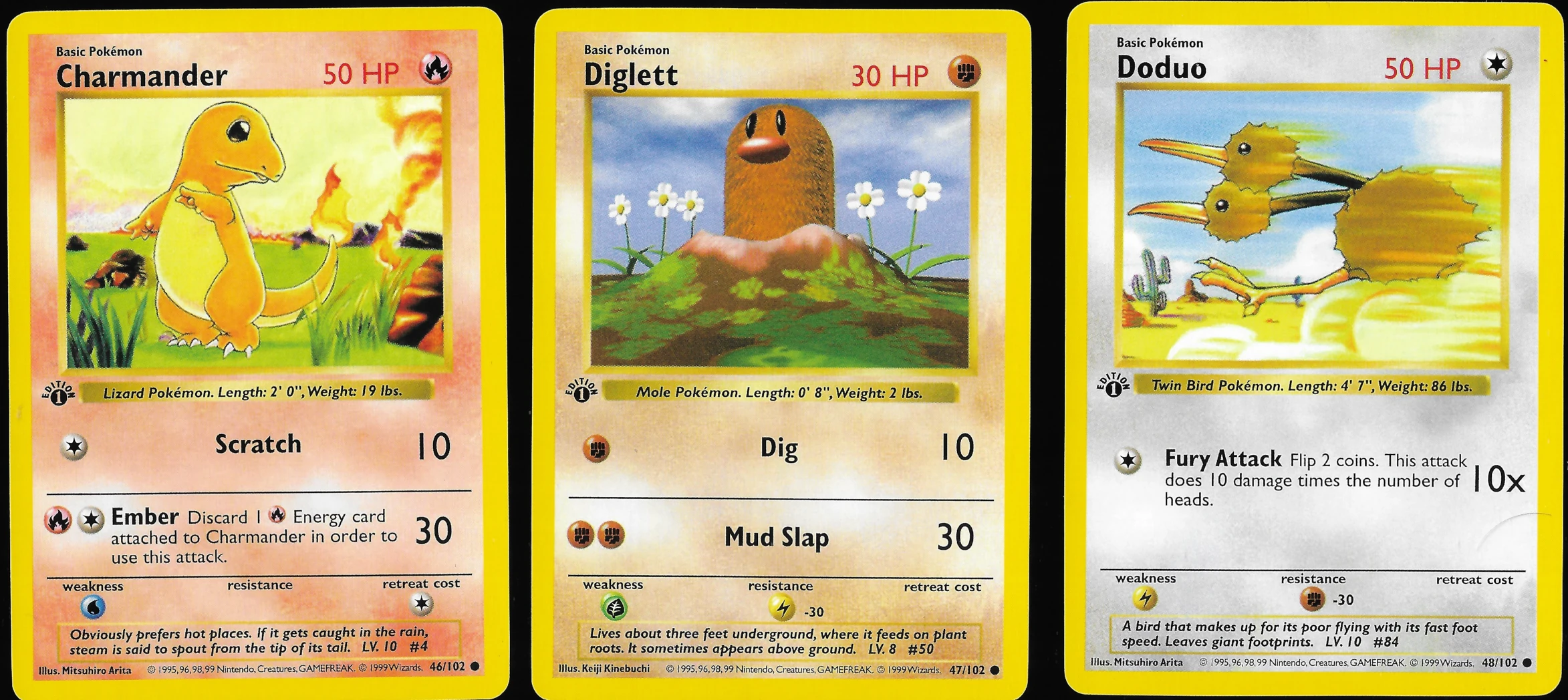 If you compare these to a genuine 1st Edition card, you’ll see the difference; the original printing technology from the 90s didn’t have the same digital clarity. Aside from the print quality, there are several errors throughout the set, such as misplaced energy symbols, text issues, and cropped graphics. This Diglett, for example, appears to have a duplicated energy symbol for its Weakness and Resistance.