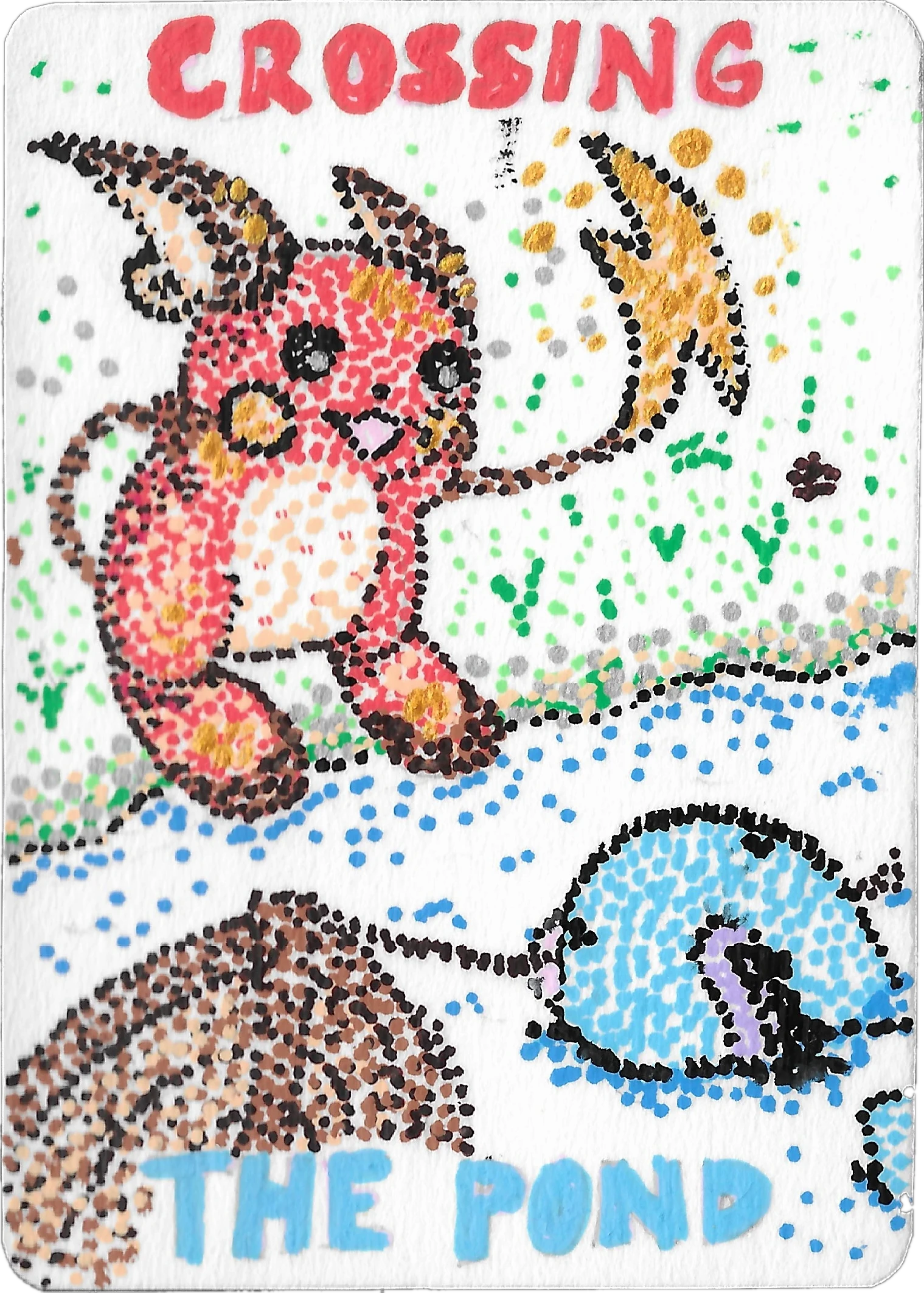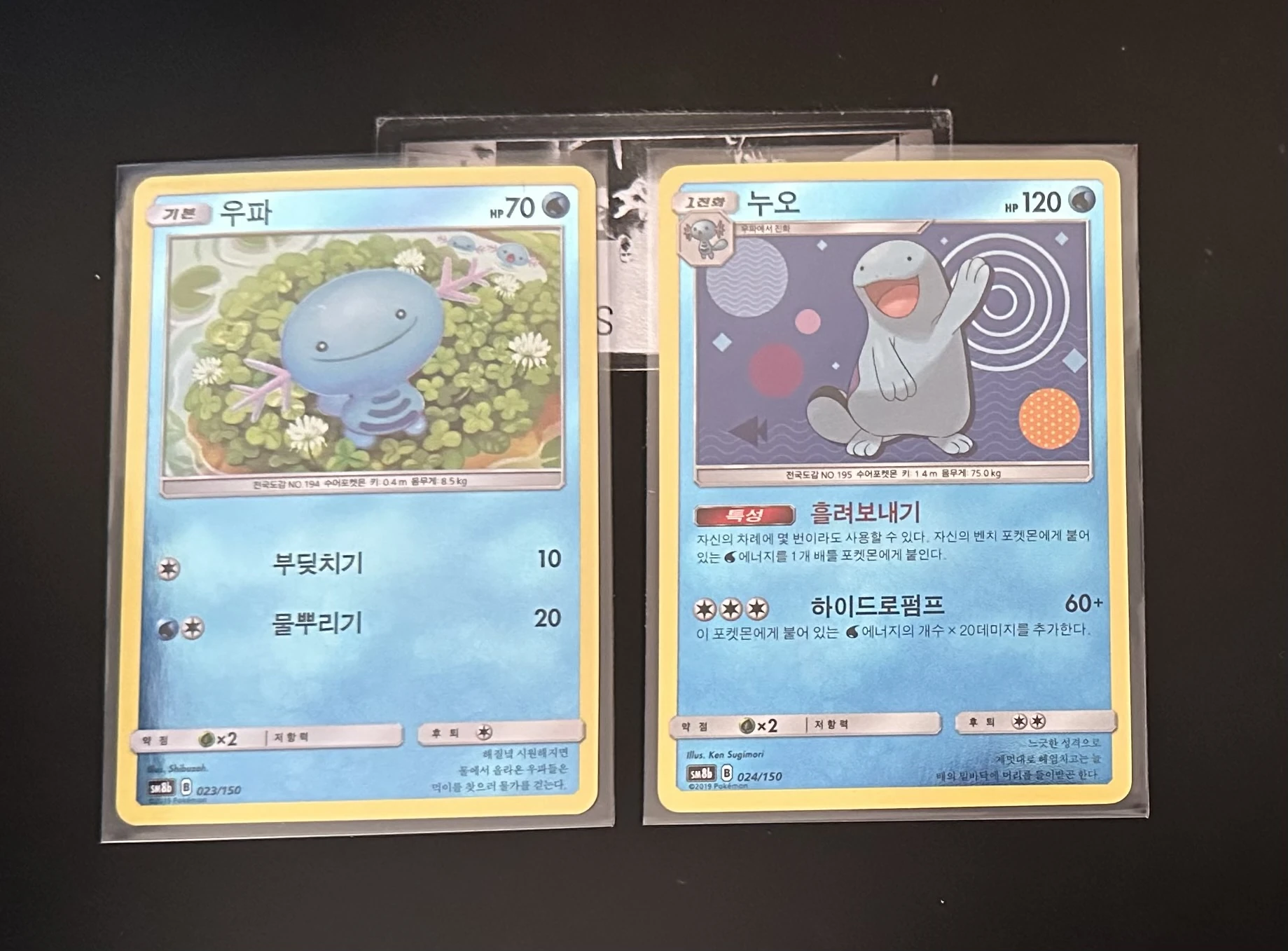 For this trade, I used paint pens to illustrate Crindy’s two favorite Pokémon, Quagsire and Wooper on top of two Korean mirror-foil Water Energy cards to give them a bit of extra shine. This was only the second time I had ever drawn on a card, and the first time I had actually colored one in. I don’t usually add color to projects like this because I’m colorblind and sometimes end up using completely different colors than intended.